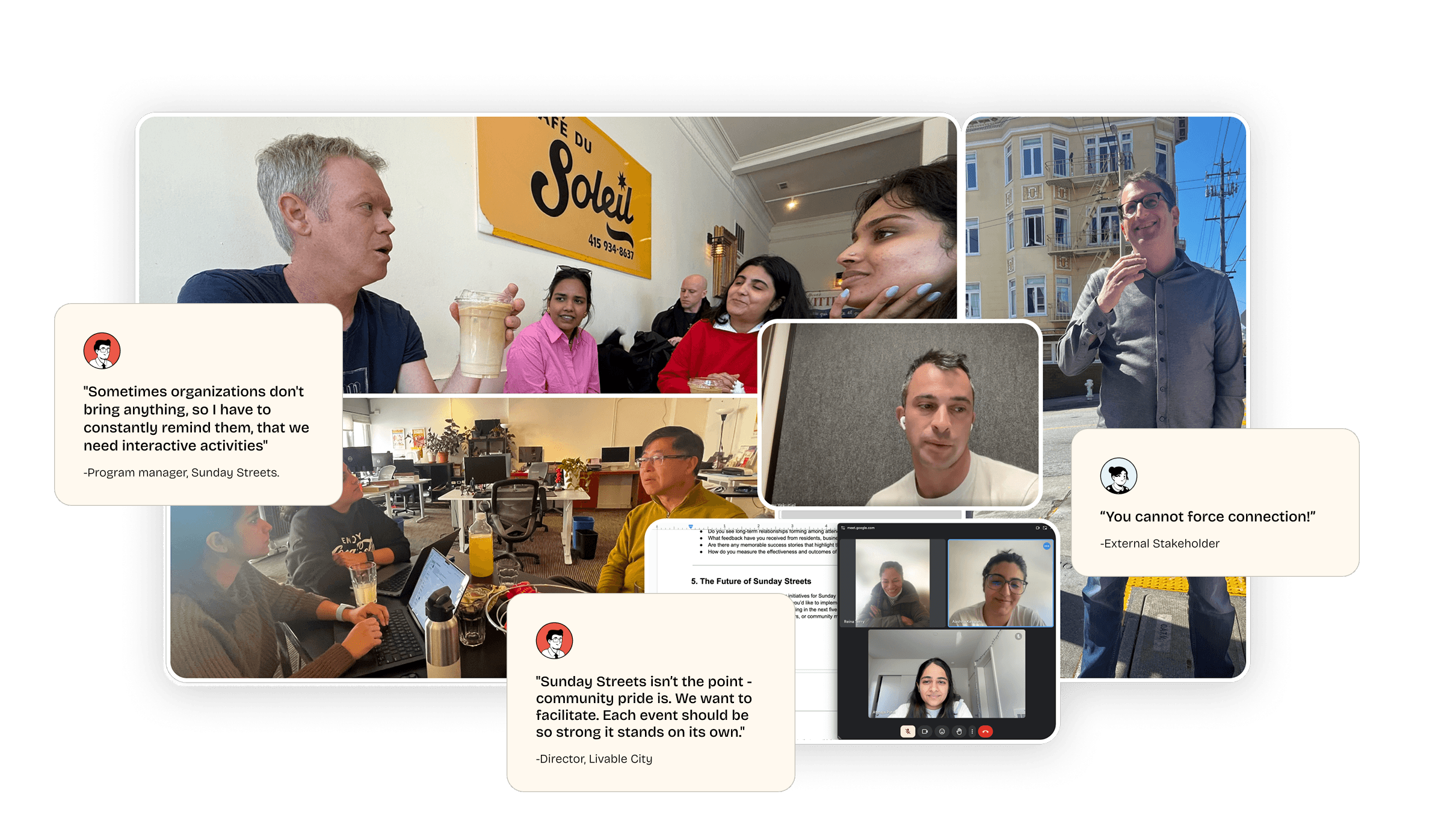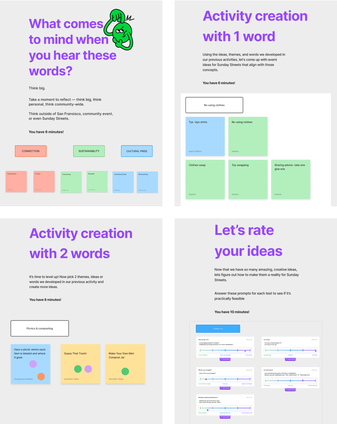 We began by interviewing internal stakeholders to understand the behind the scenes planning of Sunday Streets. Additionally, we also spoke with individuals involved in similar initiatives, to better understand what truly helps communities connect and thrive.